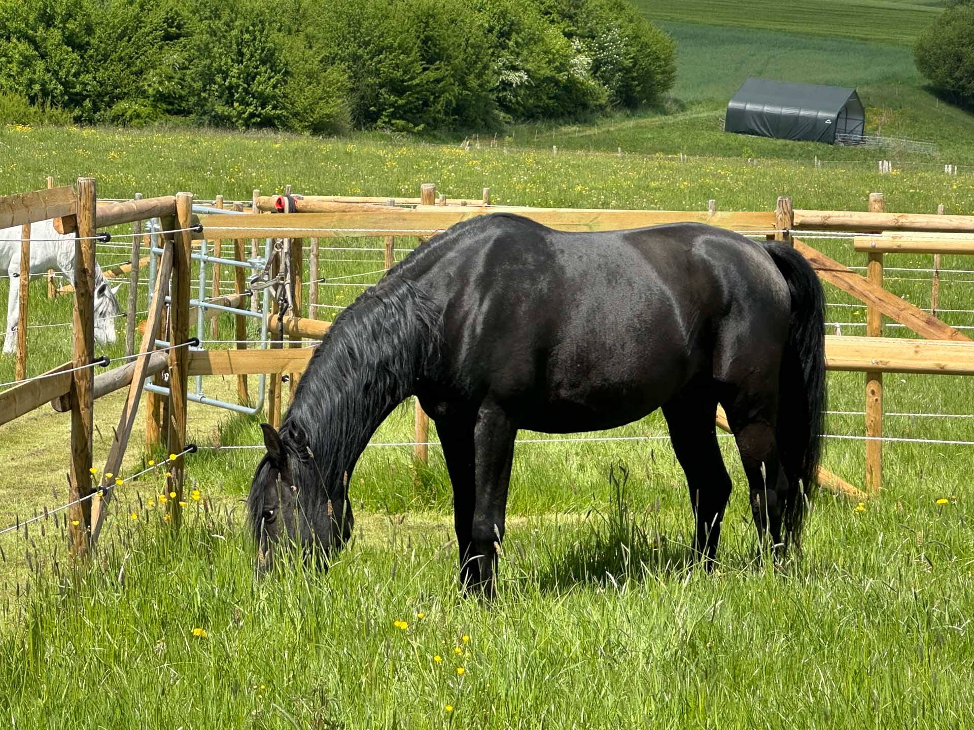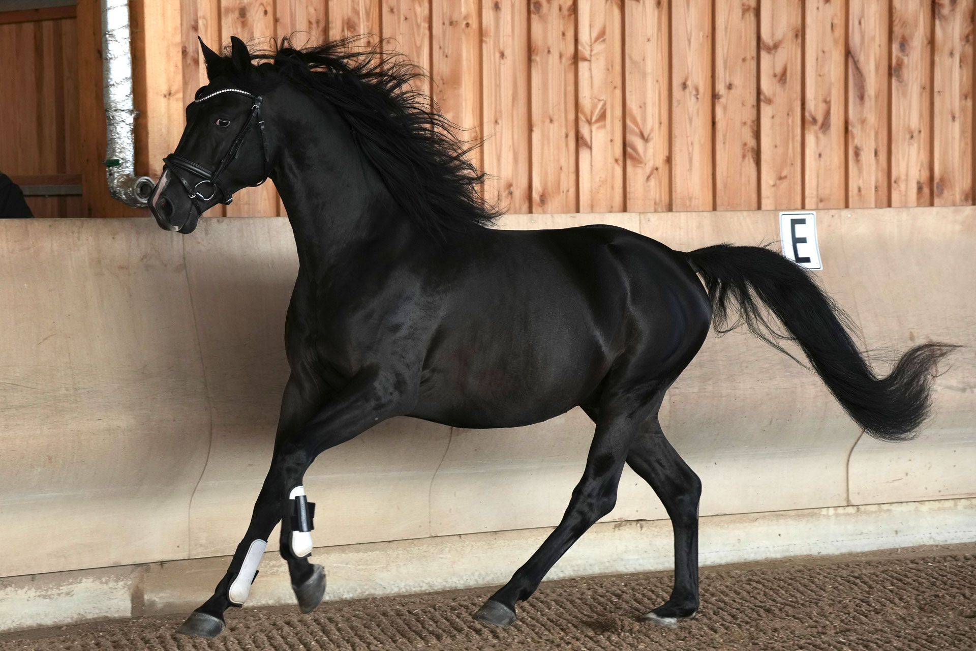 Ein maskuliner Hengst mit großem Auge, harmonischer Rückenlinie und eine unter den Schwerpunkt tretende Hinterhand.